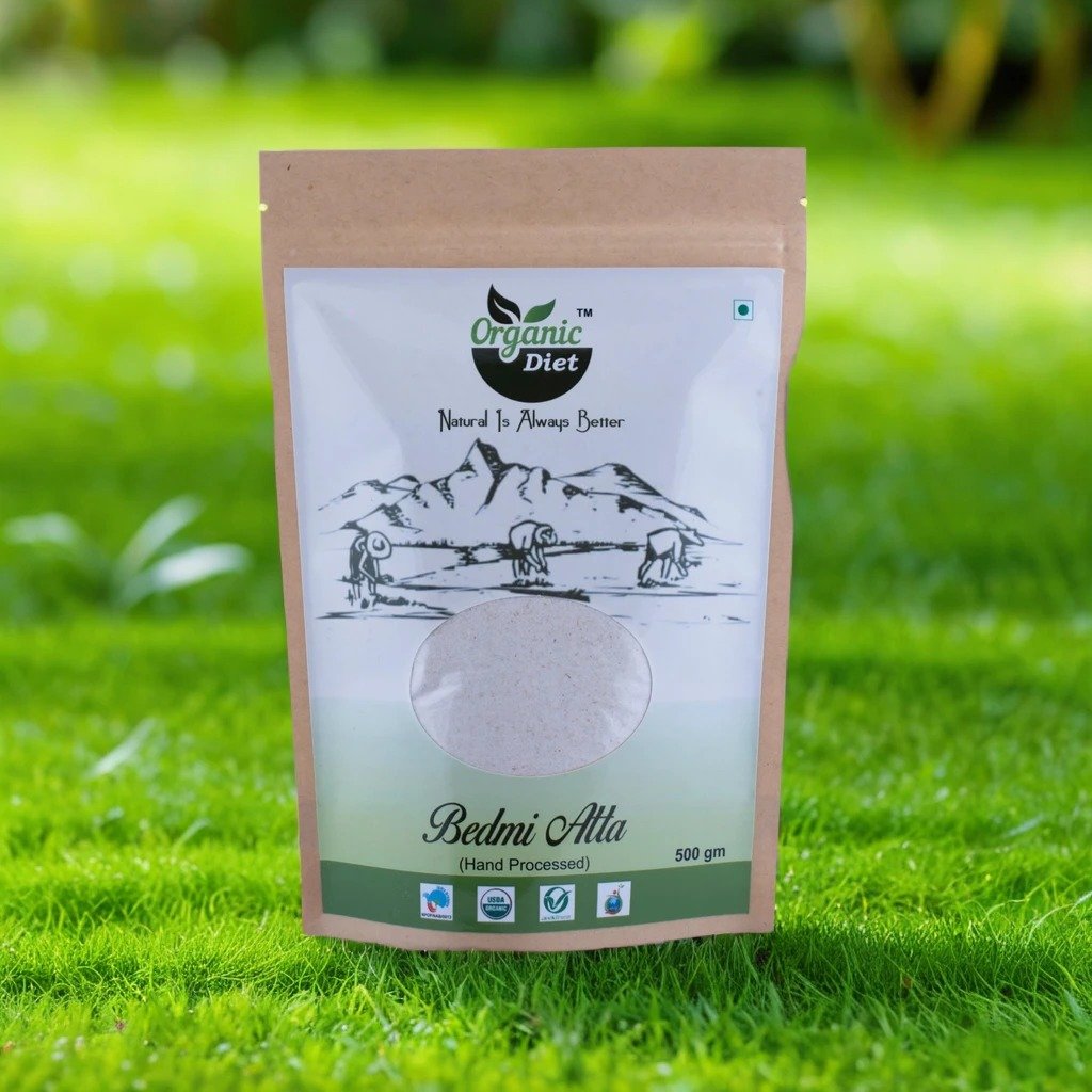 Organic Bedmi Atta is Poori atta mix is ready to cook instant product for all who love to eat poori. Easy to make , this is spicy masala mixed poori atta of wheat , urad dal , sooji , spices and condiments , salt etc. It is pure and tasty without preservative / color.